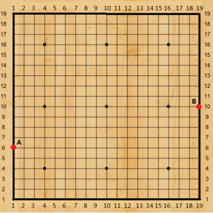 我们用一对整数 (x, y) 来表示棋盘上第 x 条横线(从下往上数)与第 y 条竖线(从左往右数)的交叉点,如上图中边框上的 A 点用( 6, 1) 表示, B 点用 (10, 19) 表示,小机器人初始时放置在 (x1,y1) 这个位置上, 它想要移动到 (x2, y2) 这个位置上。 (x1, y1) 和(x2, y2) 一定是棋盘边框上的交叉点每一步小机器人可以从当前位置移动到相邻(上下左右)的某个位置上, 即每次可以从 (x, y) 移动到 (x - 1, y) 、 (x + 1, y) 、 (x, y - 1) 、 (x, y + 1) 四个位置中的一个, 但是它不能走出或走进棋盘,也就是说它只能沿着棋盘的边框移动到相邻位置, 这就意味着任一时刻相邻位置都恰好只有两个。